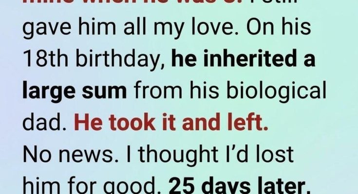 On his 18th birthday, everything shifted. He received a large inheritance from his biological father—someone who had never been there, never raised him, never stayed up during his fevers or taught him how to ride a bike. And just like that, my son took the money… and left. No explanation. No goodbye. Just silence.