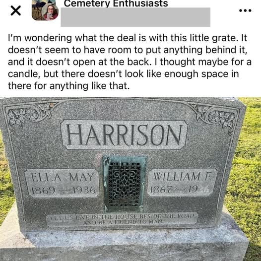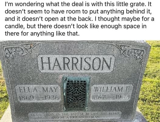 Set into the marker like a secret, the cast-iron grate turns the grave into a threshold rather than an ending. It echoes the old houses of a century ago, where heat rose through patterned vents and families gathered above them, talking, working, laughing. Here, that same humble object becomes a quiet vow: that the comforts of home, once fiercely loved, will not be surrendered even to death.