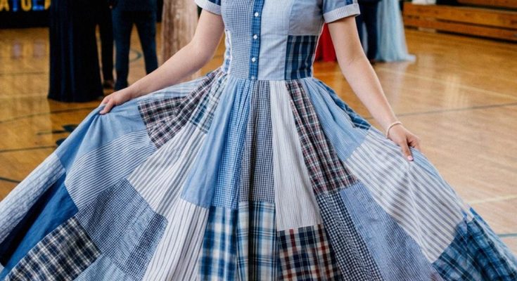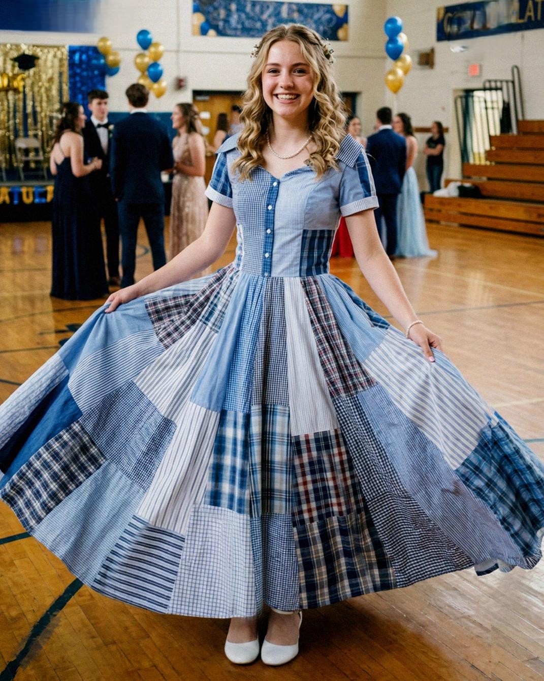 Prom season arrived with its usual frenzy of designer labels and luxury cars. I felt completely detached until I looked at those shirts—the blue ones, the grays, and the faded green one he wore the day he taught me to ride a bike. I realized that if he couldn’t be there to take photos, I could carry him with me. My Aunt Hilda helped me deconstruct his wardrobe, stitching together a dress that was a literal catalog of my life with him. Every seam was a memory; every panel of fabric was a hug I could no longer receive.