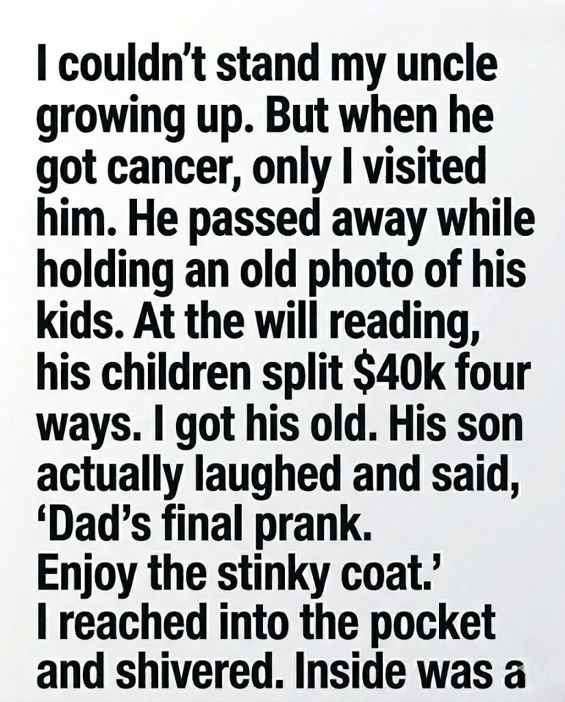 Walking out into the autumn air, the old coat settled on his shoulders with unexpected gravity. It was scratchy, unfashionable, and suddenly priceless. Arthur hadn’t rewarded performance; he had rewarded presence. Those long, wordless afternoons in a dim living room had been weighed and counted, not as sentiment, but as proof. Elias understood now that the inheritance wasn’t just wealth—it was a worldview. In a family obsessed with being seen, his uncle had chosen the one person who had been willing to simply be there.