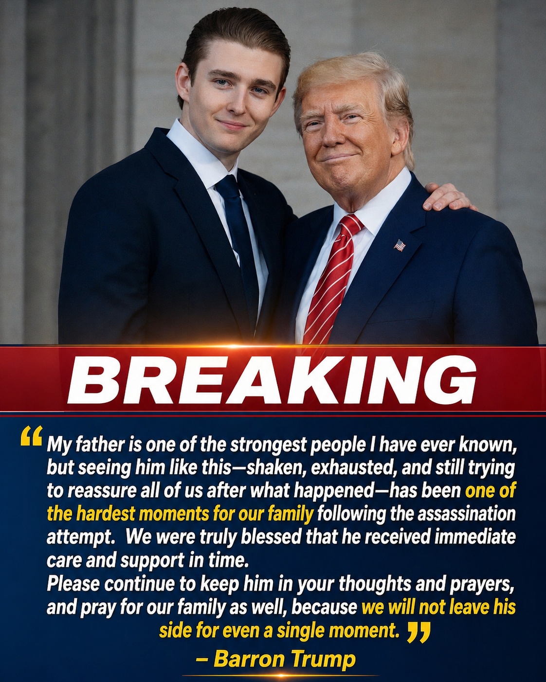 Barron’s statement highlighted not only concern for his father’s physical condition but also the psychological strain that followed the traumatic event.